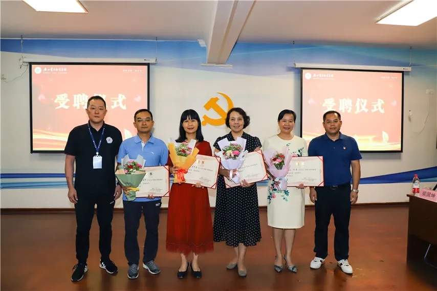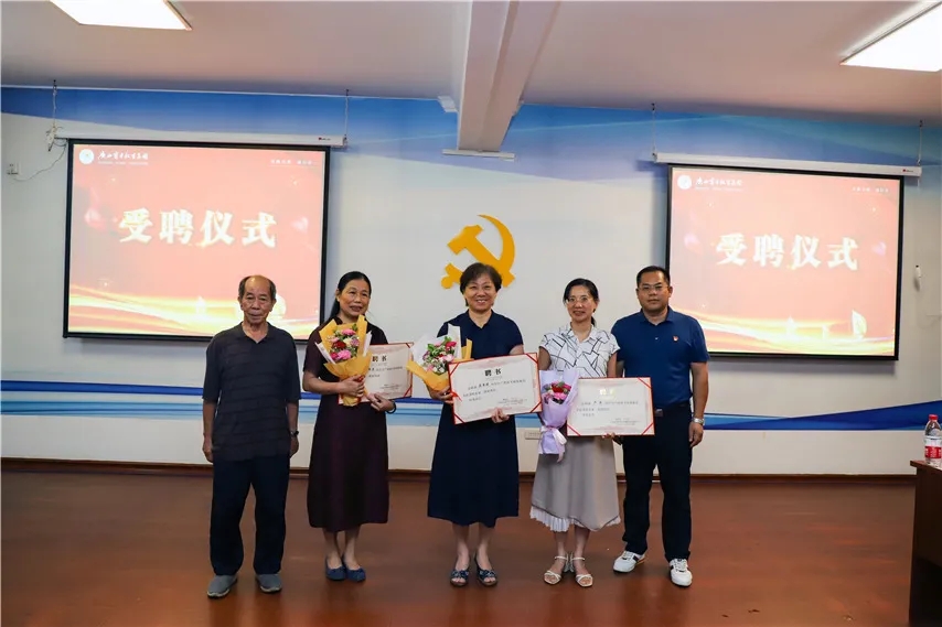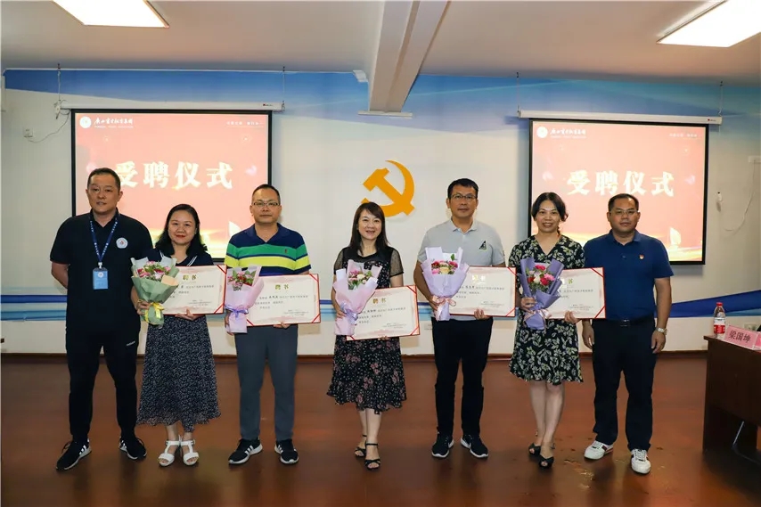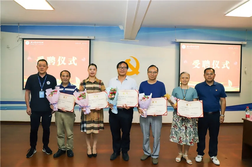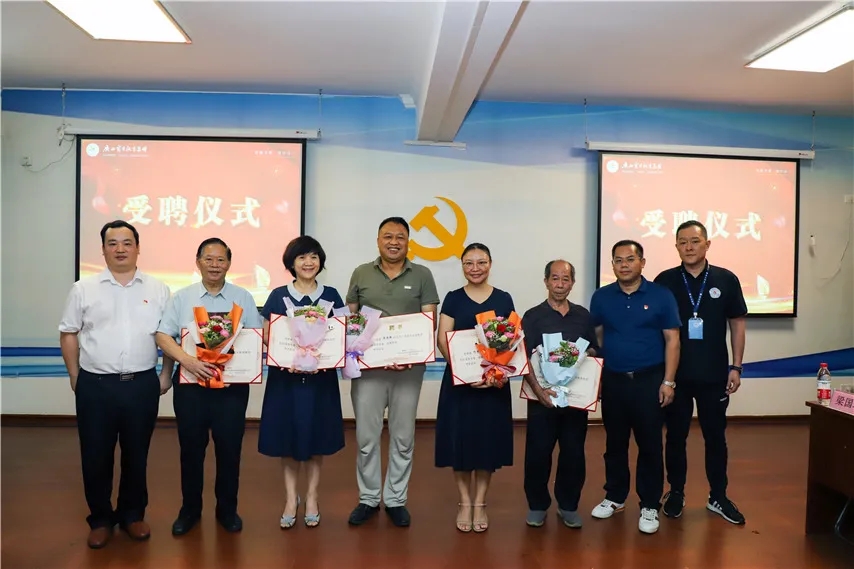 ▲集團(tuán)黨委書記、董事長(zhǎng)蔣華為來自南寧、賀州和柳職院受聘專家頒發(fā)聘書!