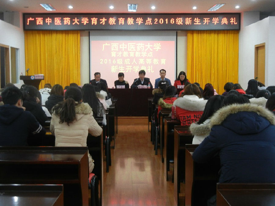 又是一年春草綠,又是一年花盛開。懷揣新的希望和夢(mèng)想,2016年1月23日上午10:00,廣西中醫(yī)藥大學(xué)育才教育教學(xué)點(diǎn)2016級(jí)成人高等教育新生開學(xué)典禮在柳州市中醫(yī)院隆重舉行。廣西中醫(yī)藥大學(xué)成教院韋艾凌院長(zhǎng)、黃瑞誠(chéng)副院長(zhǎng)出席了開學(xué)典禮,韋艾凌院長(zhǎng)作了重要講話。廣西育才教育集團(tuán)董事長(zhǎng)、廣西中醫(yī)藥大學(xué)育才教育教學(xué)點(diǎn)負(fù)責(zé)人蔣華老師,育才教育王志校長(zhǎng)、李彩梅副校長(zhǎng)以及來自柳州各大醫(yī)院、衛(wèi)生院、醫(yī)藥公司和藥店等200多名新生共同參加了開學(xué)典禮,典禮由廣西中醫(yī)藥大學(xué)成教院黃瑞誠(chéng)副院長(zhǎng)主持。