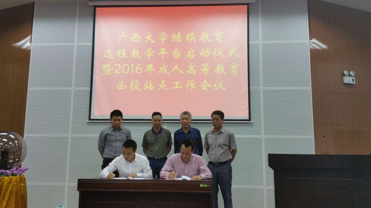 廣西大學(xué)、二級學(xué)院領(lǐng)導(dǎo)、開發(fā)公司、我教學(xué)點(diǎn)蔣華老師作為函授站點(diǎn)代表共同啟動遠(yuǎn)程教學(xué)上線儀式