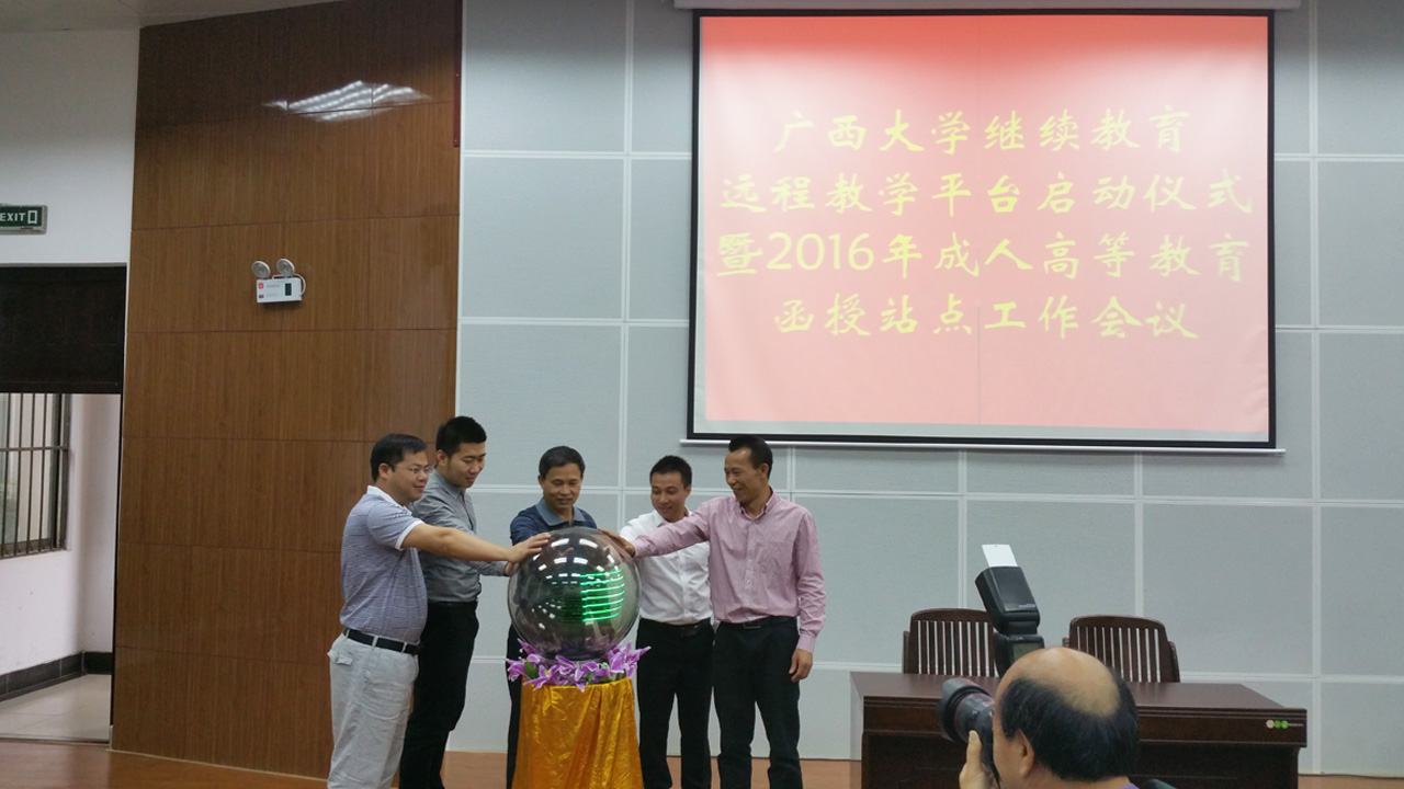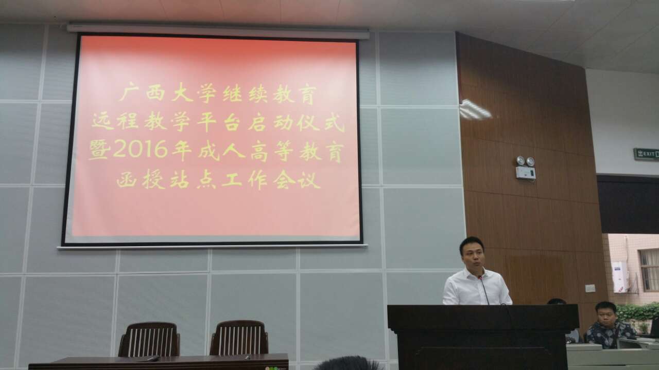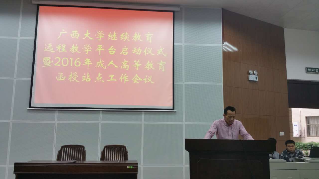 廣西大學(xué)繼續(xù)教育遠(yuǎn)程教學(xué)平臺啟動儀式暨2016年成人高等教育函授站點(diǎn)工作會4月22日在廣西大學(xué)繼續(xù)教育學(xué)院一樓會場隆重召開,會議由盧紹副院長主持。