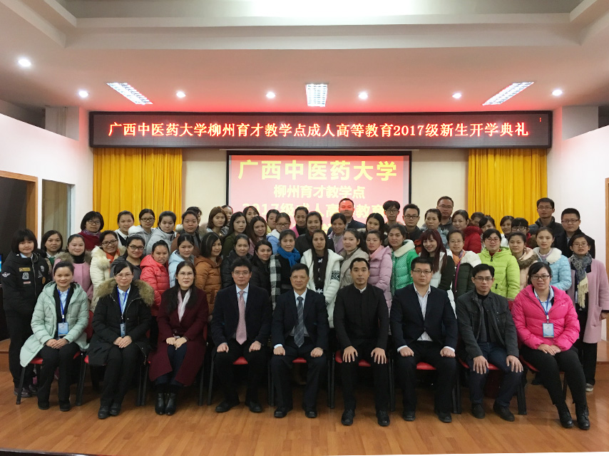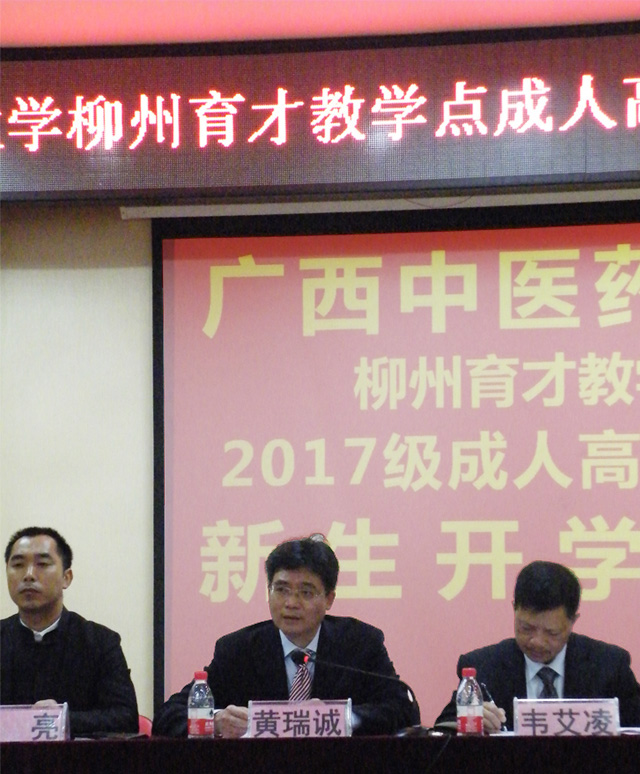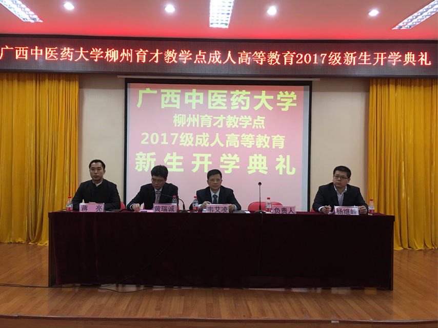 廣西中醫(yī)藥大學(xué)柳州育才教學(xué)點(diǎn)2017級成人高等教育新生開學(xué)典禮在柳州市中醫(yī)院勝利召開,廣西中醫(yī)藥大學(xué)成教院院長、博士生導(dǎo)師、二級教授韋艾凌、副院長黃瑞誠、院長助理、培訓(xùn)部主任楊繼峰出席開學(xué)典禮,韋艾凌院長、黃瑞誠副院長作重要講話。育才教育李彩梅副校長、蔣亮副校長以及來自柳州各大醫(yī)院、衛(wèi)生院、醫(yī)藥公司和藥店等100多名新生代表共同參加了開學(xué)典禮。開學(xué)典禮由育才學(xué)工辦主任陳韻先主持。