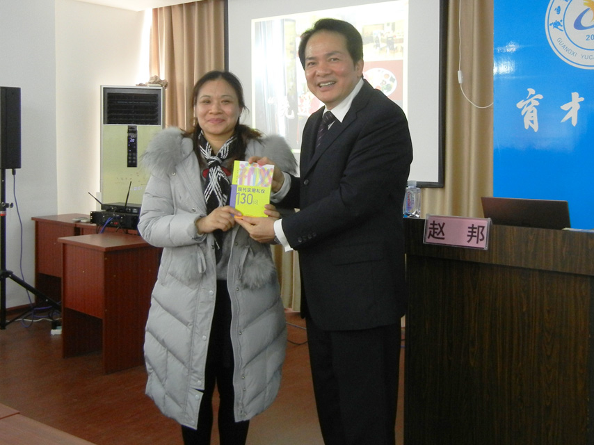 趙邦教授主編的《現(xiàn)代實(shí)用禮儀130問》書籍,育才負(fù)責(zé)人蔣華和多位學(xué)員獲得趙邦教授現(xiàn)場簽名贈書。