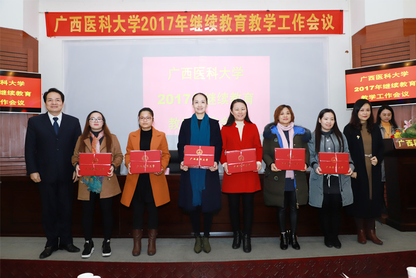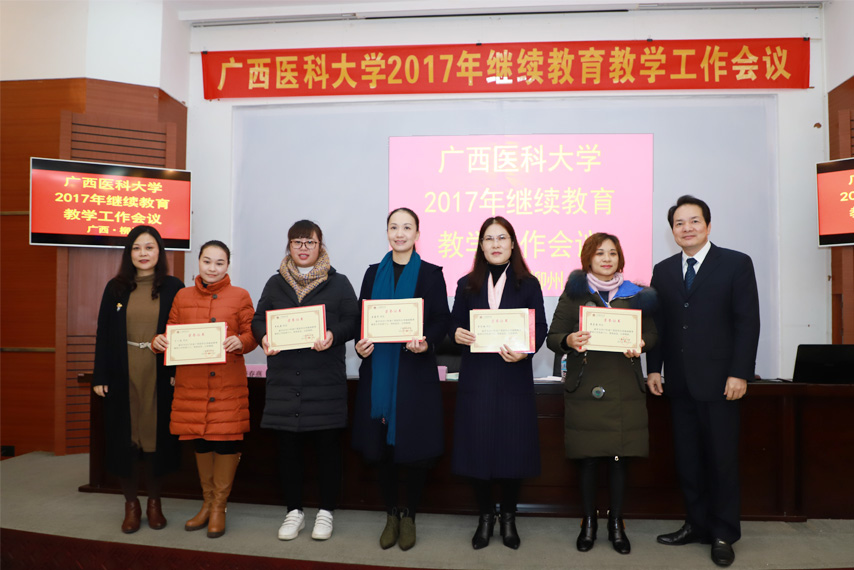 廣西醫(yī)科大學(xué)2017年繼續(xù)教育教學(xué)工作“先進(jìn)個(gè)人”--育才李彩梅副校長(zhǎng)(右三)、韋彥清副校長(zhǎng)(右二)、韋秋燕主任(左三)