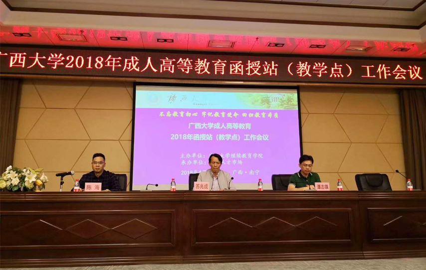 4月27日,廣西大學(xué)2018年成人高等教育函授站(教學(xué)點(diǎn))工作會(huì)議在南寧召開(kāi),本次會(huì)議由廣西大學(xué)繼續(xù)教育學(xué)院主辦,廣西人才市場(chǎng)函授站承辦,廣西大學(xué)繼續(xù)教育學(xué)院院長(zhǎng)蘇兆成、副院長(zhǎng)陳海、各科室科長(zhǎng)老師以及來(lái)自各函授站(教學(xué)點(diǎn))的負(fù)責(zé)人和老師等參加了會(huì)議。