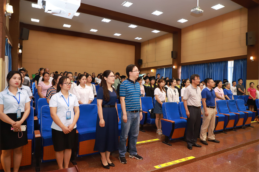 畢業(yè)典禮在莊嚴(yán)的國(guó)歌聲中拉開序幕。何創(chuàng)雄副院長(zhǎng)代表學(xué)校向順利完成學(xué)業(yè)的畢業(yè)生們表示熱烈的祝賀,勉勵(lì)畢業(yè)生在今后要積極進(jìn)取,終生學(xué)習(xí),不僅可以繼續(xù)選擇廣西師范大學(xué)提升學(xué)歷,專升本,本升研,還要學(xué)以致用,讓自己的綜合能力得到進(jìn)一步提高。