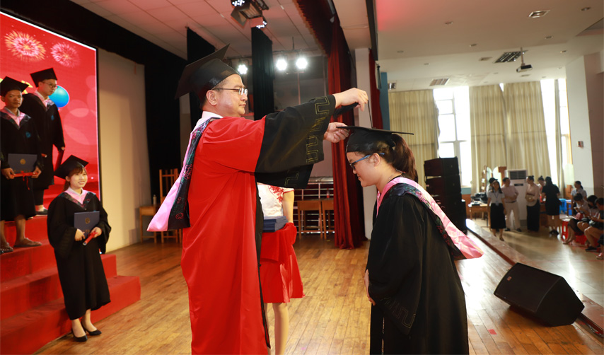 典禮上,全場的畢業(yè)生代表起立鼓掌向?qū)W院領(lǐng)導(dǎo)和老師們行“感恩禮”。韋鴻鵬院長為獲得學(xué)士學(xué)位的畢業(yè)生代表逐一行“撥穗禮”并授予學(xué)士學(xué)位證書。