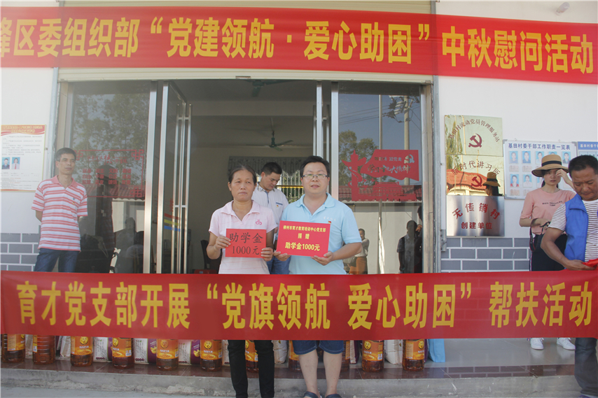 活動(dòng)中,柳州市育才教育培訓(xùn)中心黨支部為貧困戶張頂福家中考上黑龍江大學(xué)的兒子捐獻(xiàn)愛(ài)心助學(xué)款1000元;為貧困戶陳文筆家中上高中的女兒捐獻(xiàn)愛(ài)心助學(xué)款1000元。