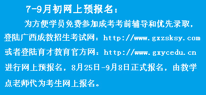 1、報(bào)考時(shí)間:即日起開(kāi)始報(bào)名。網(wǎng)上報(bào)名時(shí)間:8月底--9月初,考生可登陸廣西招生考試院網(wǎng)站(http://www.gxeea.cn)報(bào)名,為方便學(xué)員免費(fèi)參加成考考前輔導(dǎo)班和順利錄取,同時(shí)避免考生在網(wǎng)上報(bào)名系統(tǒng)中填寫(xiě)錯(cuò)誤,可在教學(xué)點(diǎn)招生老師指導(dǎo)下登陸廣西招生考試院網(wǎng)站報(bào)名。