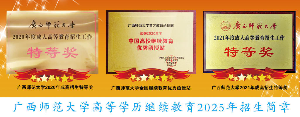 廣西師范大學成人教育辦學已有五十多年的歷史,培養(yǎng)了9萬多名成教本??茖W生,是“全國成人高等教育評估優(yōu)秀學校”、“全區(qū)成人高等教育評估優(yōu)秀學?!保菢s獲“教育部高等學校繼續(xù)教育示范基地”和具有成人教育學碩士授權點的高校,是全國成人高等學校招生統(tǒng)一考試(簡稱成人高考)考區(qū)。